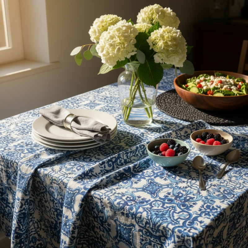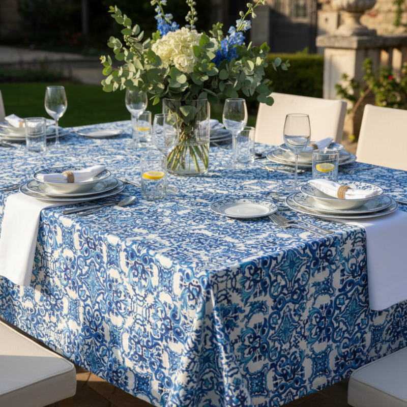 Nappe arabesque bleue (grand motif) imperméable et anti tâches