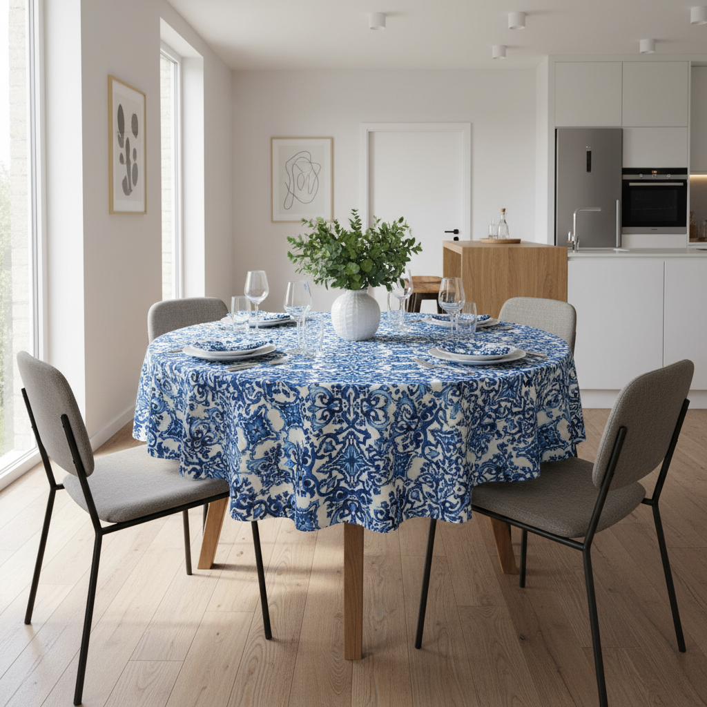 Apportez du caractère et du raffinement à votre table avec notre nappe aux motifs arabesques bleus, inspirée d’un charme classique revisité avec modernité. Confectionnée en toile imperméable et anti tâches, elle protège efficacement votre table contre les liquides et les petits accidents du quotidien.