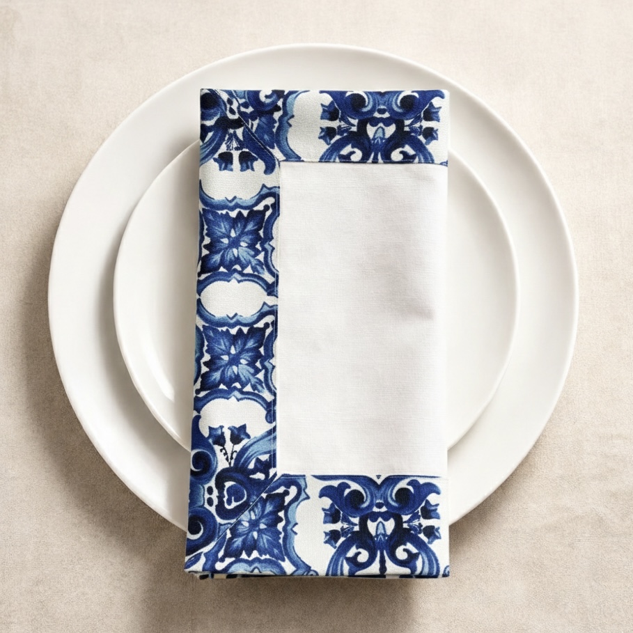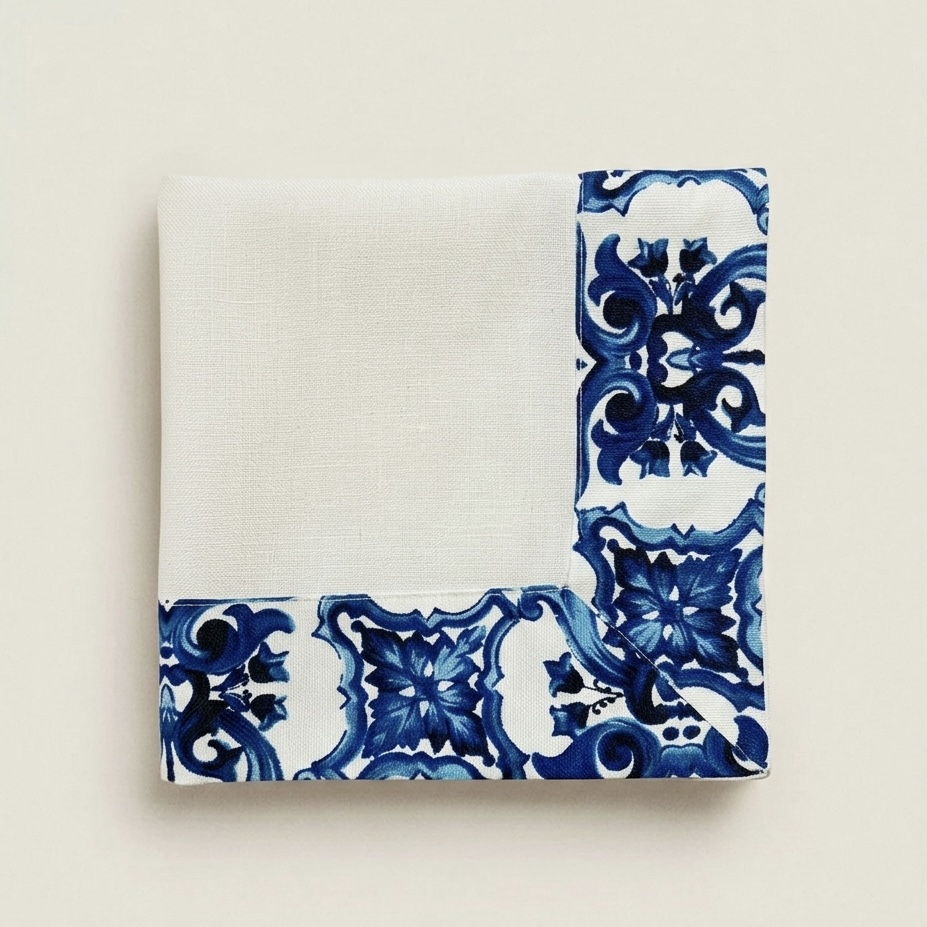 Apportez une touche d’élégance intemporelle à votre table avec nos serviettes carrées 40x40cm. Conçues dans un blanc cassé raffiné, elles sont sublimées par de magnifiques bordures à motif arabesque bleu, inspirées des carreaux traditionnels et du charme méditerranéen. Fabriquées en toile imperméable et anti tâches, ces serviettes allient esthétique et praticité.