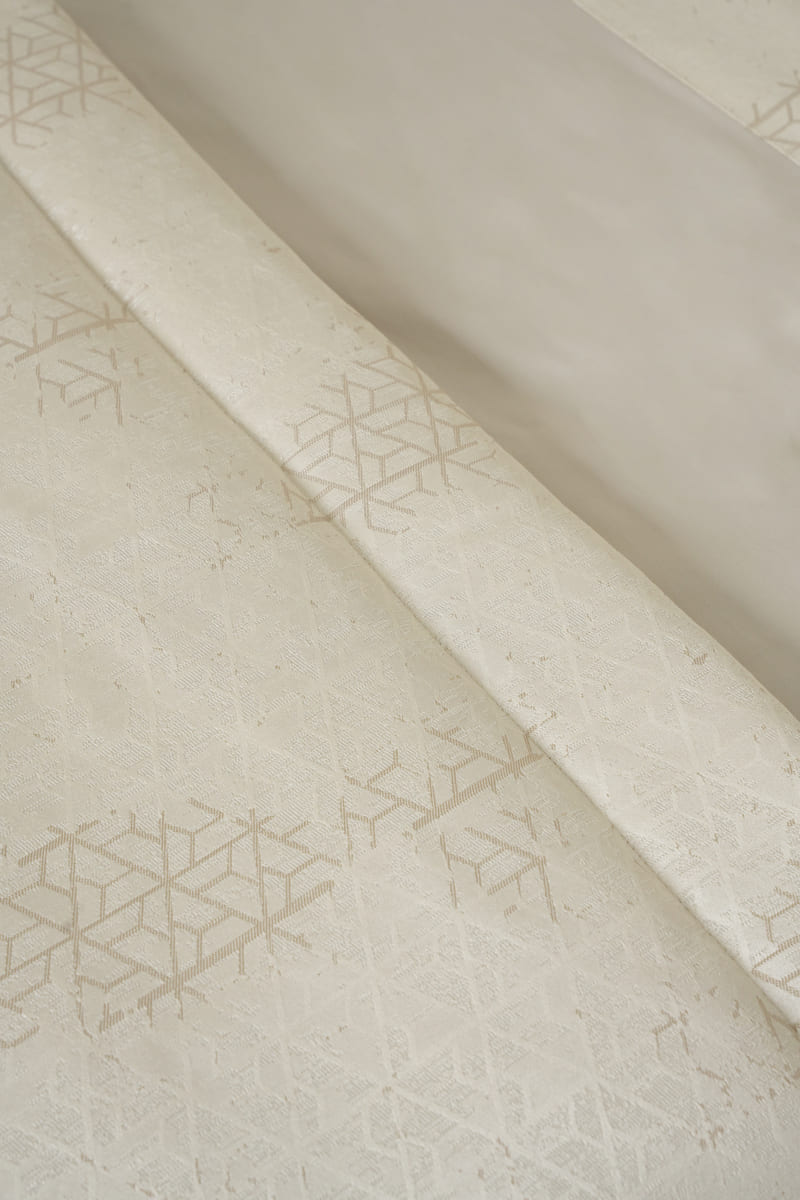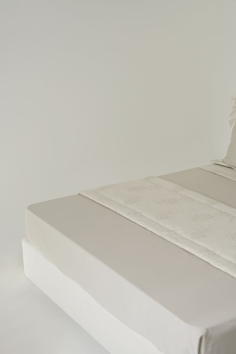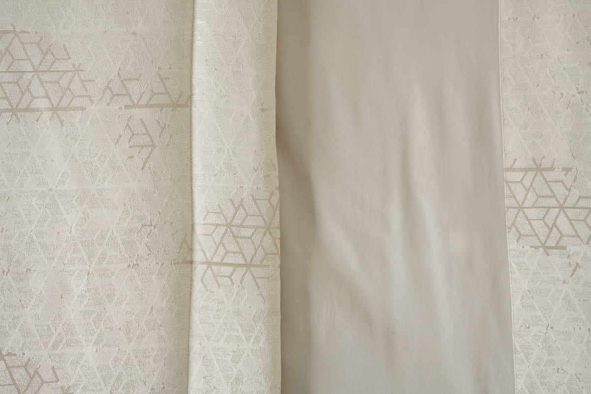 Ce chemin de lit 56x250cm est conçu en double face, avec une face jacquard géométrique entrelacé dans une matière légèrement scintillante et une contre-face en coton grège clair. Sa bordure de 9cm apporte une finition élégante et structurée, faisant de ce chemin de lit un accessoire raffiné qui rehausse l’esthétique et le confort de votre linge de lit.
