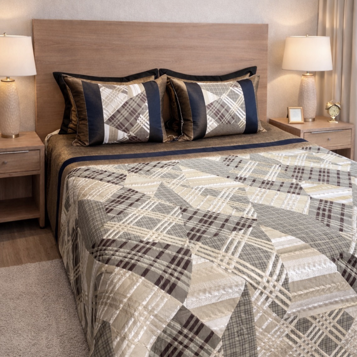 Ce couvre-lit au design moderne joue avec des rayures et motifs graphiques pour apporter du caractère et du style à votre chambre. Ses nuances naturelles créent une atmosphère chaleureuse et élégante.