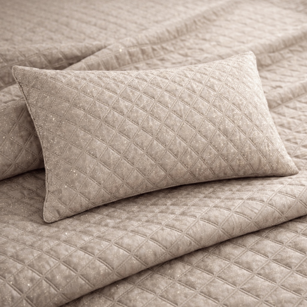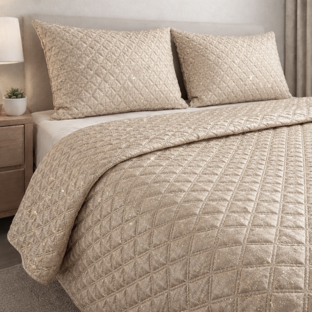 Offrez à votre intérieur une note chic et chaleureuse avec ce jeté de lit matelassé doré délicatement pailleté. Son motif géométrique en losanges apporte du relief et du caractère, tandis que son éclat subtil capte la lumière pour une ambiance raffinée et enveloppante.