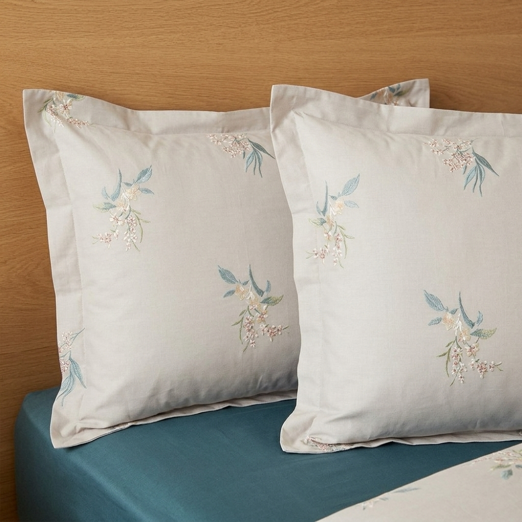 Parure de lit imprimée – Bouquet grège et bleu canard