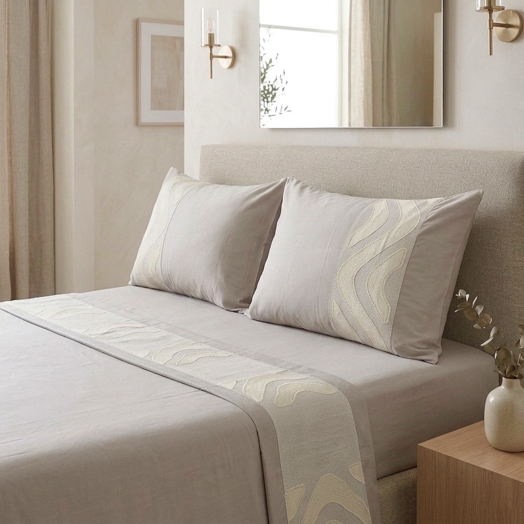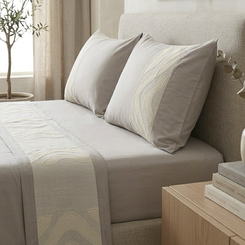 Complétez votre univers de détente avec cette parure de lit en satin de coton unie, pensée pour allier élégance et confort absolu. Sa couleur grège, subtile fusion de beige et de gris, confère à la chambre une ambiance naturelle et sophistiquée, facile à associer à tous les styles de décoration. La douceur satinée du coton offre un toucher délicat et un sommeil des plus agréables, tandis que la bande en lin ajoute une note de charme authentique et de finition haut de gamme. Ce pack se compose d’un drap housse, d’un drap plat et de deux taies d’oreiller assorties, créant un ensemble harmonieux et raffiné pour des nuits empreintes de douceur et d’élégance.
